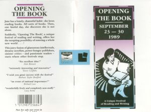 The Opening the Book Festival of September 1989 changed the face of literary festivals. Popular and literary writers rubbed shoulders for the first time; novelists and poets mingled with football correspondents and writers of soaps, adverts, erotica, screenplays and comics. There were workshops on writing diaries, committee reports and love letters. And there was lots about reading. Jean Binta Breeze ran the first ever workshop on Creative Reading; Barry Hines invited people to bring a book which made them cry or laugh out loud; and every day a different personality chatted about their favourite books and how reading had influenced their lives in a Desert Island Books slot. Many of these ideas have become standard items in festivals since.